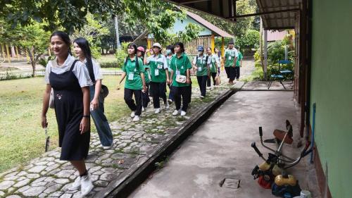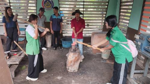 🩵วันที่ ๑๗ กันยายน ๒๕๖๘ เวลา ๑๐.๓๐ น. ส่วนงานพัฒนาชุมชนในศูนย์ศึกษาการพัฒนาเขาหินซ้อนอันเนื่องมาจากพระราชดำริ จังหวัดฉะเชิงเทรา ให้การต้อนรับคณะครูและนักเรียนจากโรงเรียนบ้านทับร้าง อำเภอบ่อทอง จังหวัดชลบุรี จำนวน ๖๐ คน เข้าศึกษาดูงานในฐานการเรียนรู้งานศิลปาชีพตามแนวพระราชดำริ โดยมี นางสาวจิดาภา ท่าหิน นักวิเคราะห์นโยบายและแผน บรรยายภารกิจของส่วนงานพัฒนาชุมชนในศูนย์ศึกษาการพัฒนาเขาหินซ้อนฯ และแนะนำผลิตภัณฑ์จักสานแฮนด์เมดที่นำมาจัดแสดงประกอบด้วย กระเป๋า หมวก เสื่อกก เป็นต้น จากนั้น นำคณะฯ ชมการสาธิตการจักสานและทอเสื่อจากเส้นใยพืช การทอผ้า การเดินเส้นทอง การตีเหล็ก และบ้านพอเพียง พร้อมถ่ายภาพหมู่ที่ระลึกที่ศาลาศิลปาชีพ ณ บ้านพ่อ🦣