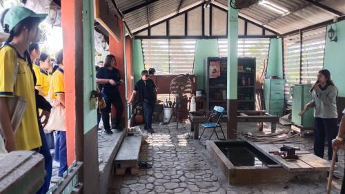 วันที่ ๒๖ ธันวาคม ๒๕๖๘ เวลา ๑๐.๐๐ น. ส่วนงานพัฒนาชุมชนในศูนย์ศึกษาการพัฒนาเขาหินซ้อนอันเนื่องมาจากพระราชดำริ จังหวัดฉะเชิงเทรา ให้การต้อนรับคณะครูและนักเรียนระดับมัธยมต้น จากโรงเรียนเบญจมราชรังสฤษฎ์ อำเภอเมืองฯ จังหวัดฉะเชิงเทรา จำนวน ๑๐๒ คน เข้าศึกษาดูงานในฐานการเรียนรู้งานศิลปาชีพตามแนวพระราชดำริ โดยมี นางสาวจิดาภา ท่าหิน นักวิเคราะห์นโยบายและแผน บรรยายภารกิจของส่วนงานพัฒนาชุมชนในศูนย์ศึกษาฯ และแนะนำผลิตภัณฑ์จักสานแฮนด์เมดที่นำมาจัดแสดงประกอบด้วย กระเป๋า หมวก เสื่อกก เป็นต้น จากนั้น นำคณะฯ ชมการสาธิตการจักสานและทอเสื่อจากเส้นใยพืช การทอผ้า การเดินเส้นทอง การตีเหล็ก และบ้านพอเพียง พร้อมถ่ายภาพร่วมกันกับช้างพลายดินดี